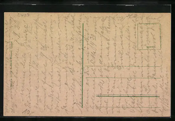 Personenbezogene Daten auf der Rückseite der Karte wurden durch blauen Textmarker unkenntlich gemacht. Die blauen Stellen sind auf die Vorderseite durchgeweicht und wirken sich negativ auf das Postkartenfoto aus