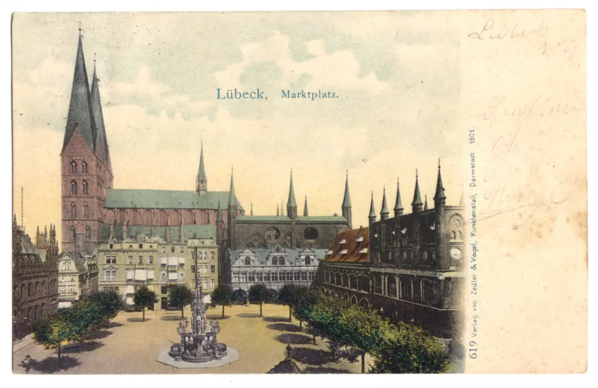 Ansichtskarte Lübeck Marktplatz Erhaltung II, Marke entfernt, etwas bügig postalisch gelaufen, gestempelt: Lübeck, .... Druckvermerk: 1901 Verlag: Zedler & Vogel, Darmstadt - 619 Im Inland erfolgt die Zusendung versandkostenfrei Auslandsversand erfolgt über