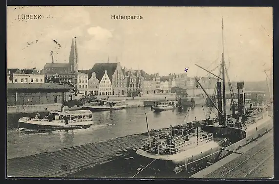 AK Lübeck, Ortsansicht mit Hafenpartie