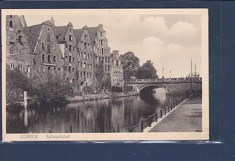 AK Lübeck Salzspeicher, gelaufen von 1934, hat leider oben mittig einen kleinen Einriss.
