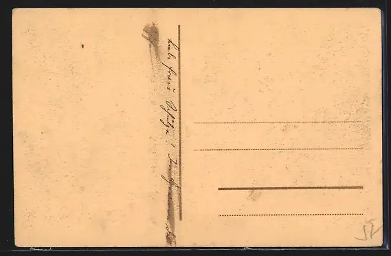 Personenbezogene Daten auf der Rückseite der Karte wurden durch blauen Textmarker unkenntlich gemacht. Die blauen Stellen sind auf die Vorderseite durchgeweicht und wirken sich negativ auf das Postkartenfoto aus