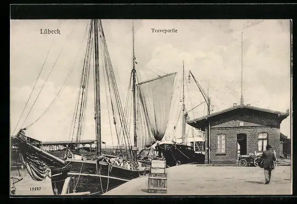 AK Lübeck, Travepartie mit Segelschiffen und Ufergebäude