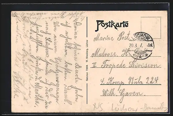 Personenbezogene Daten auf der Rückseite der Karte wurden durch blauen Textmarker unkenntlich gemacht. Die blauen Stellen sind auf die Vorderseite durchgeweicht und wirken sich negativ auf das Postkartenfoto aus