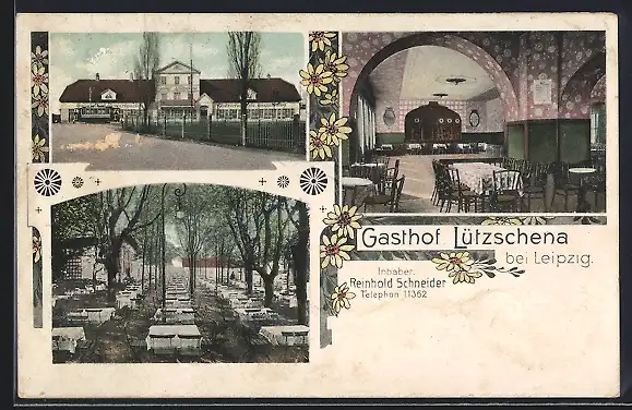 AK Lützschena, Blick auf den Gasthof, Innansicht, Speisesaal, Gartencafé