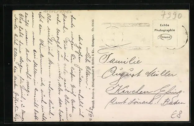 Personenbezogene Daten auf der Rückseite der Karte wurden durch blauen Textmarker unkenntlich gemacht. Die blauen Stellen sind auf die Vorderseite durchgeweicht und wirken sich negativ auf das Postkartenfoto aus