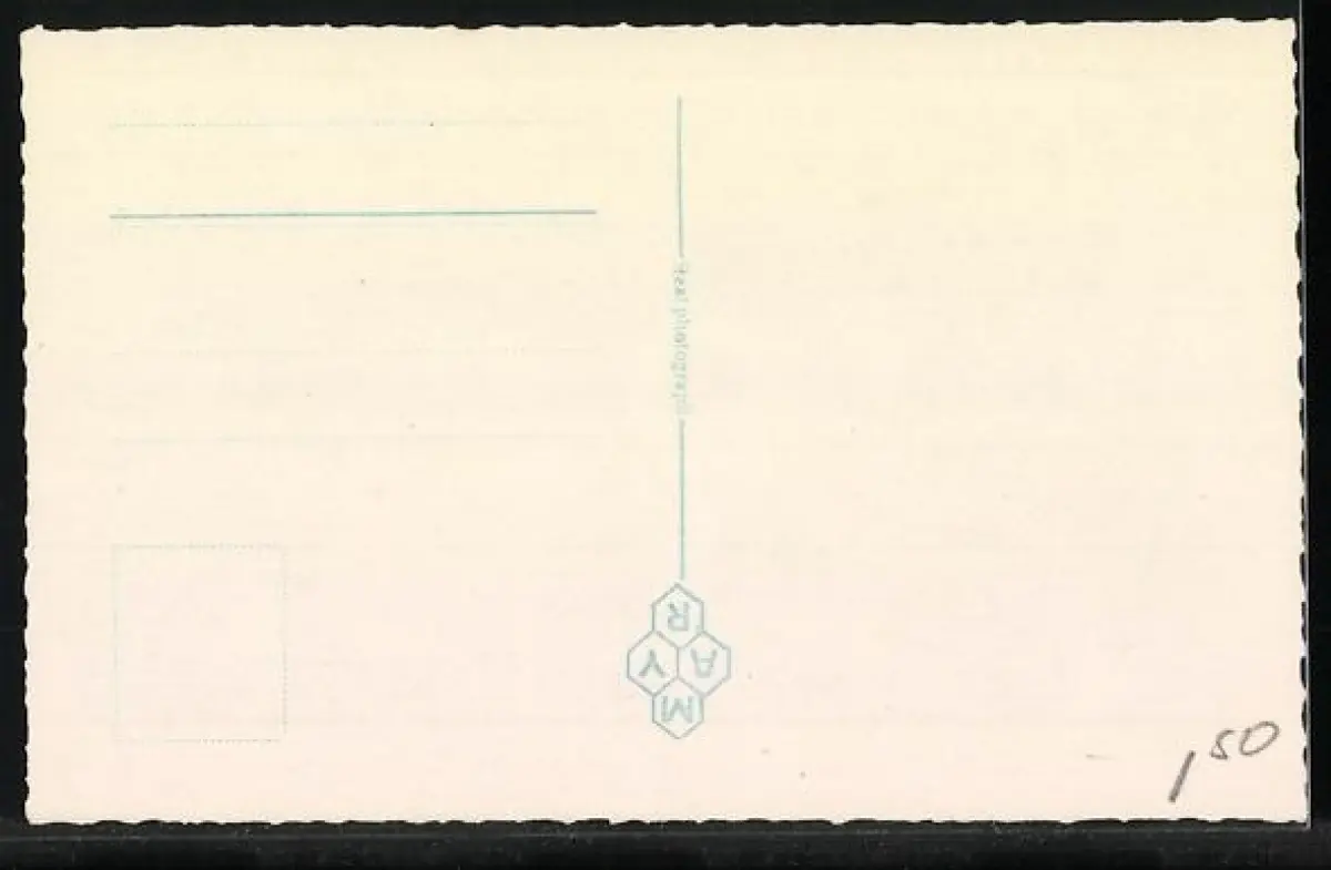 Personenbezogene Daten auf der Rückseite der Karte wurden durch blauen Textmarker unkenntlich gemacht. Die blauen Stellen sind auf die Vorderseite durchgeweicht und wirken sich negativ auf das Postkartenfoto aus