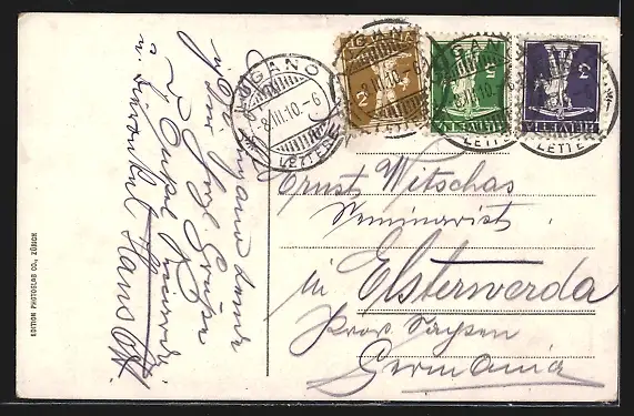 gelaufen 1910, Oberflächenschaden li. unten, Stempelspur, guter Zustand
