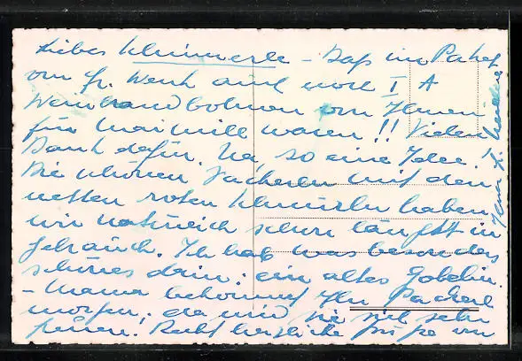 Personenbezogene Daten auf der Rückseite der Karte wurden durch blauen Textmarker unkenntlich gemacht. Die blauen Stellen sind auf die Vorderseite durchgeweicht und wirken sich negativ auf das Postkartenfoto aus