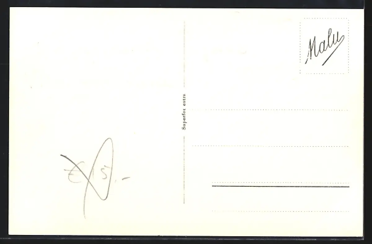 Personenbezogene Daten auf der Rückseite der Karte wurden durch blauen Textmarker unkenntlich gemacht. Die blauen Stellen sind auf die Vorderseite durchgeweicht und wirken sich negativ auf das Postkartenfoto aus