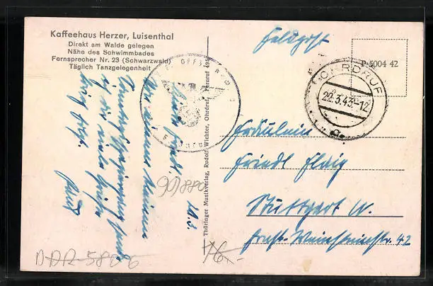 Personenbezogene Daten auf der Rückseite der Karte wurden durch blauen Textmarker unkenntlich gemacht. Die blauen Stellen sind auf die Vorderseite durchgeweicht und wirken sich negativ auf das Postkartenfoto aus