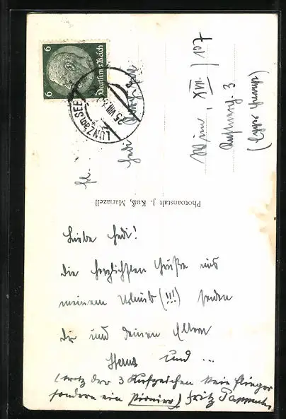 Personenbezogene Daten auf der Rückseite der Karte wurden durch blauen Textmarker unkenntlich gemacht. Die blauen Stellen sind auf die Vorderseite durchgeweicht und wirken sich negativ auf das Postkartenfoto aus
