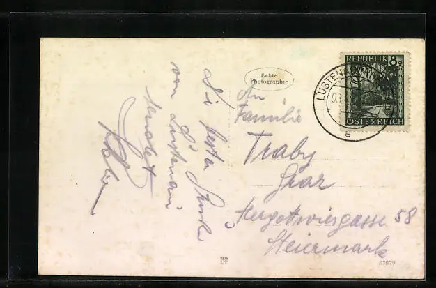 Personenbezogene Daten auf der Rückseite der Karte wurden durch blauen Textmarker unkenntlich gemacht. Die blauen Stellen sind auf die Vorderseite durchgeweicht und wirken sich negativ auf das Postkartenfoto aus