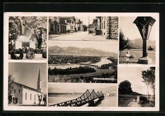 AK Lustenau, Panorama, Kirche, Strasse und Denkmal