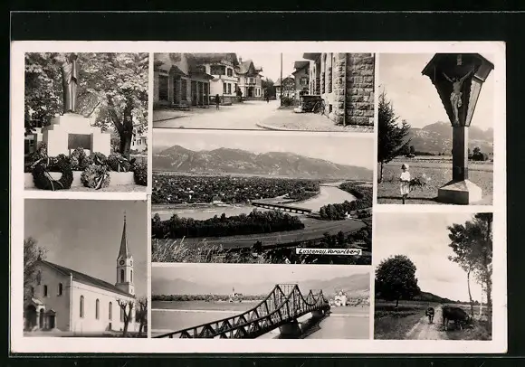 AK Lustenau, Totalansicht, Strasse, Denkmal und Kirche