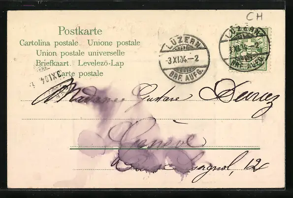 Personenbezogene Daten auf der Rückseite der Karte wurden durch blauen Textmarker unkenntlich gemacht. Die blauen Stellen sind auf die Vorderseite durchgeweicht und wirken sich negativ auf das Postkartenfoto aus