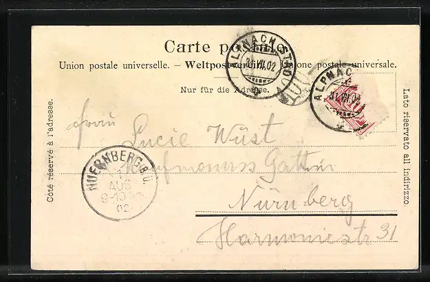 gelaufen 1902, Briefmarke entfernt, guter Zustand