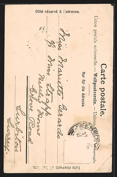 Personenbezogene Daten auf der Rückseite der Karte wurden durch blauen Textmarker unkenntlich gemacht. Die blauen Stellen sind auf die Vorderseite durchgeweicht und wirken sich negativ auf das Postkartenfoto aus