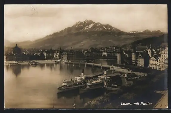 AK Luzern, Panorama mit Pilatus und Dampfer
