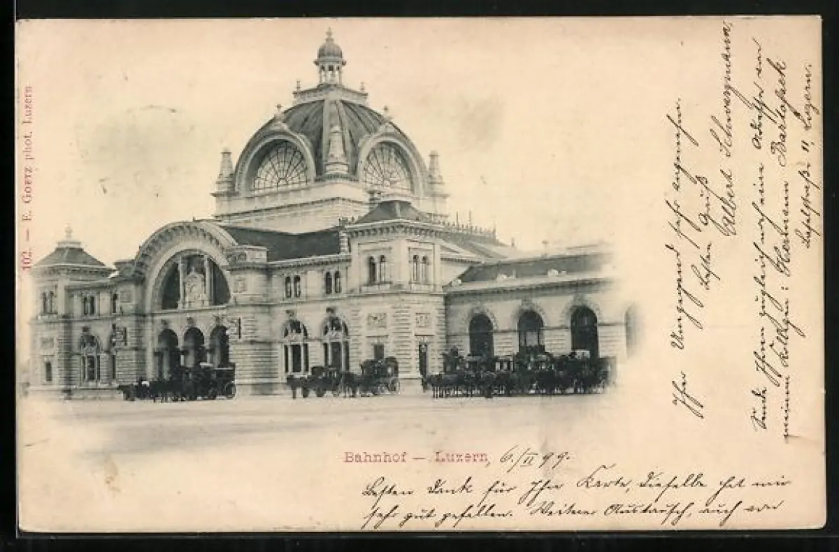 AK Luzern, Pferdekutschen vor dem Bahnhof