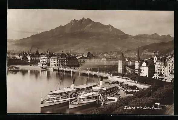 AK Luzern, Salondampfer am Anleger, Teilansicht mit Pilatus