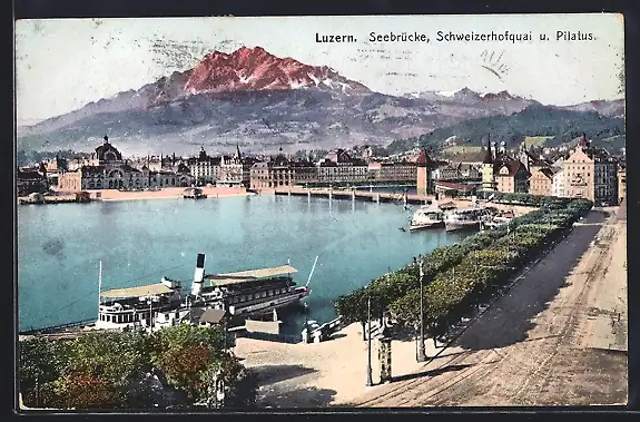 AK Luzern, Seebrücke, Schweizerhofquai u. Pilatus, Dampfer