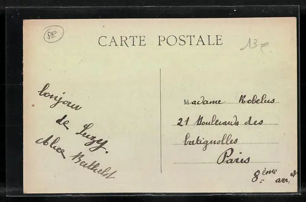Personenbezogene Daten auf der Rückseite der Karte wurden durch blauen Textmarker unkenntlich gemacht. Die blauen Stellen sind auf die Vorderseite durchgeweicht und wirken sich negativ auf das Postkartenfoto aus