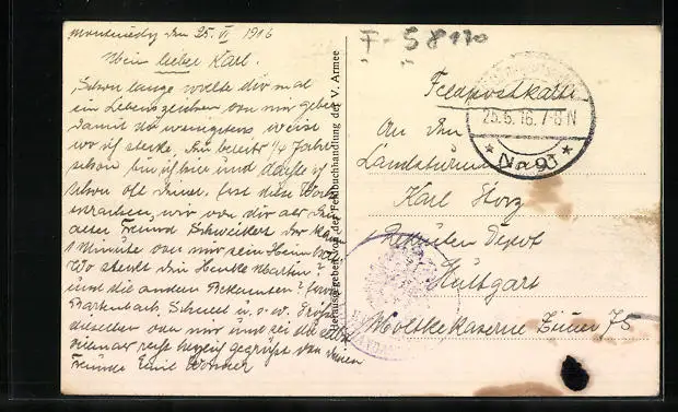 gelaufen als Feldpost 1916, rückseitig Klebe- und Papierreste, guter Zustand