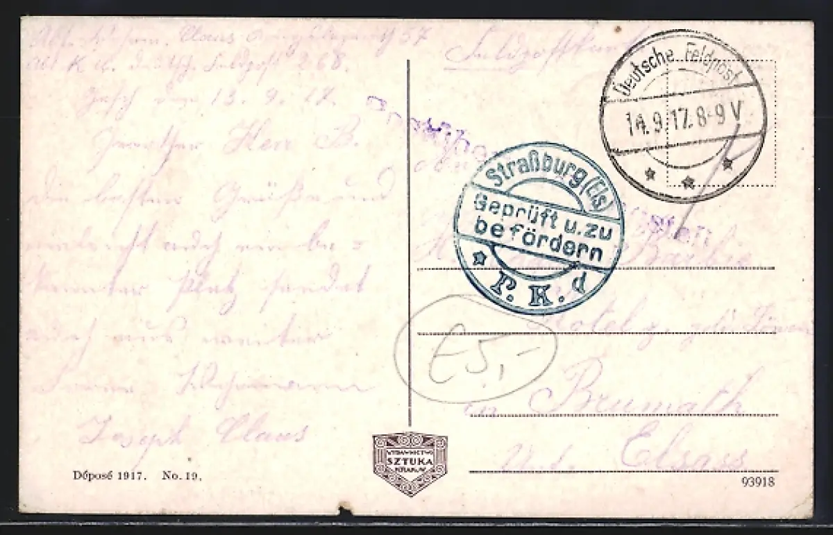gelaufen 1917, Eckknick re. oben, guter Zustand
