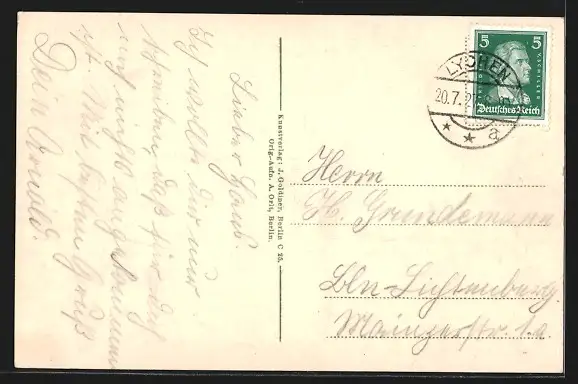 Personenbezogene Daten auf der Rückseite der Karte wurden durch blauen Textmarker unkenntlich gemacht. Die blauen Stellen sind auf die Vorderseite durchgeweicht und wirken sich negativ auf das Postkartenfoto aus