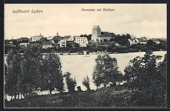 AK Lychen, Teilansicht mit Kirche und Stadtsee