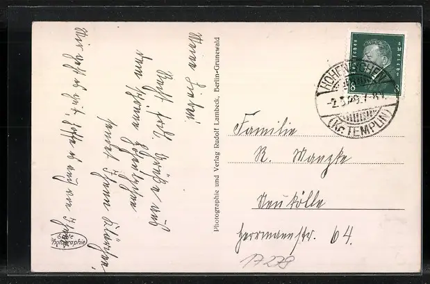 Personenbezogene Daten auf der Rückseite der Karte wurden durch blauen Textmarker unkenntlich gemacht. Die blauen Stellen sind auf die Vorderseite durchgeweicht und wirken sich negativ auf das Postkartenfoto aus