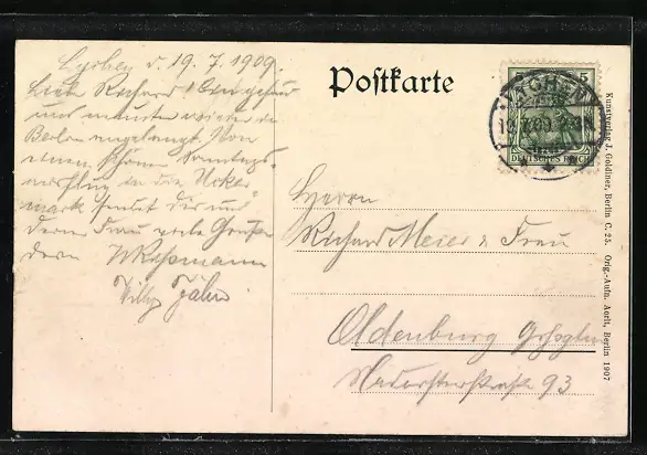 alte Ansichtskarte, gelaufen 1909, kleiner Einriss re. unten, Abriebspuren re. u. li. oben, guter Zustand