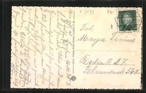 Personenbezogene Daten auf der Rückseite der Karte wurden durch blauen Textmarker unkenntlich gemacht. Die blauen Stellen sind auf die Vorderseite durchgeweicht und wirken sich negativ auf das Postkartenfoto aus