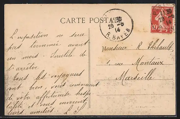 Personenbezogene Daten auf der Rückseite der Karte wurden durch blauen Textmarker unkenntlich gemacht. Die blauen Stellen sind auf die Vorderseite durchgeweicht und wirken sich negativ auf das Postkartenfoto aus