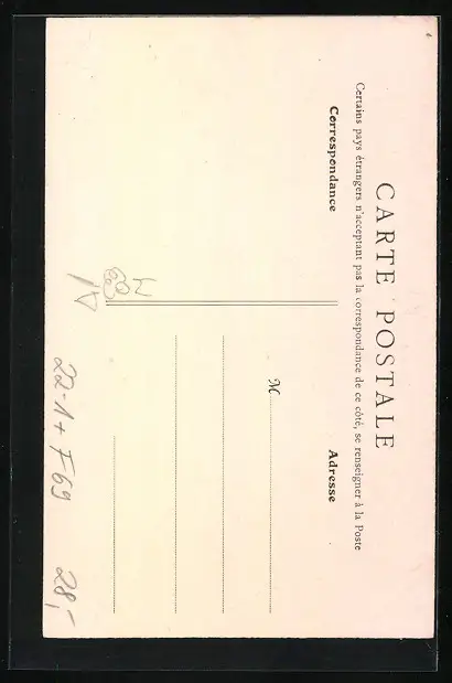 Personenbezogene Daten auf der Rückseite der Karte wurden durch blauen Textmarker unkenntlich gemacht. Die blauen Stellen sind auf die Vorderseite durchgeweicht und wirken sich negativ auf das Postkartenfoto aus