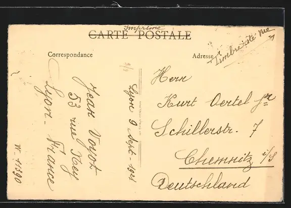 Personenbezogene Daten auf der Rückseite der Karte wurden durch blauen Textmarker unkenntlich gemacht. Die blauen Stellen sind auf die Vorderseite durchgeweicht und wirken sich negativ auf das Postkartenfoto aus
