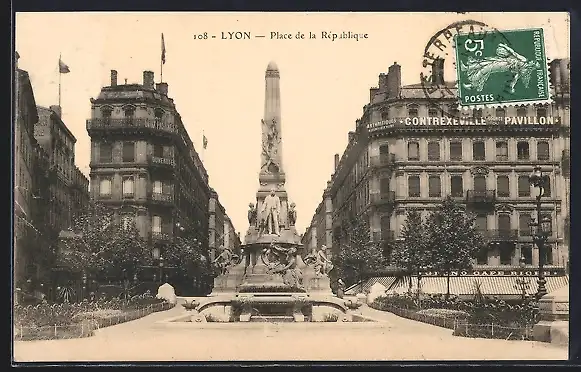 AK Lyon, Place de la République avec monument central et bâtiments environnants