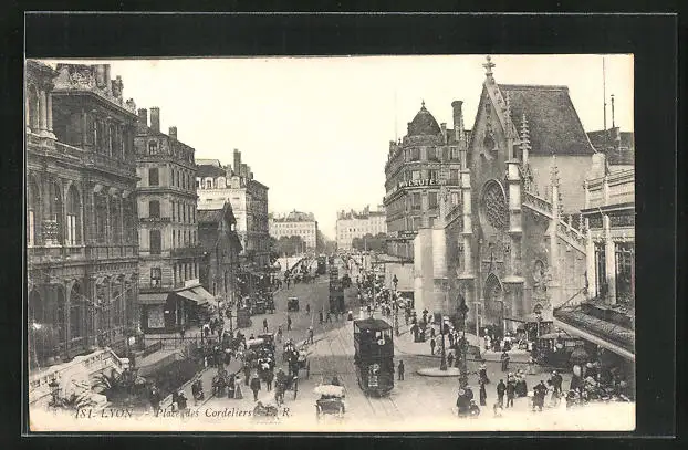 AK Lyon, Place des Cordeliers, Strassenbahn