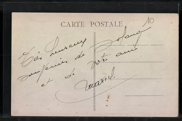 Personenbezogene Daten auf der Rückseite der Karte wurden durch blauen Textmarker unkenntlich gemacht. Die blauen Stellen sind auf die Vorderseite durchgeweicht und wirken sich negativ auf das Postkartenfoto aus