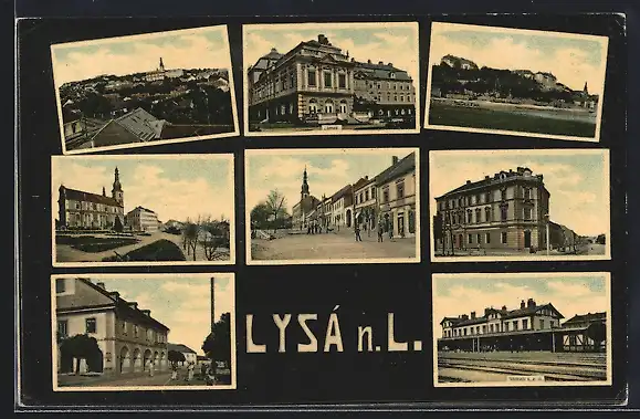 AK Lysá n. L., Bahnhof, Schloss und Kirche