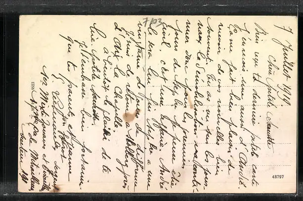 Personenbezogene Daten auf der Rückseite der Karte wurden durch blauen Textmarker unkenntlich gemacht. Die blauen Stellen sind auf die Vorderseite durchgeweicht und wirken sich negativ auf das Postkartenfoto aus