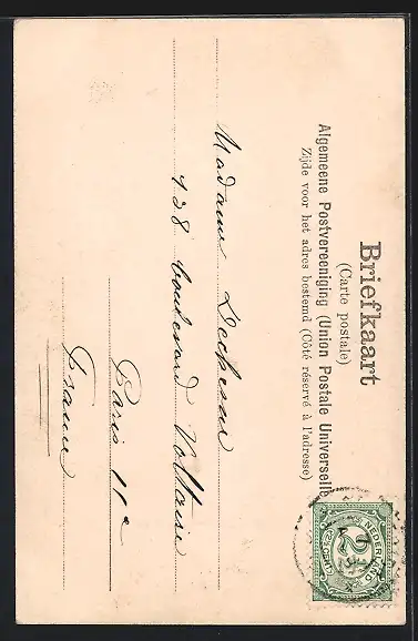 Personenbezogene Daten auf der Rückseite der Karte wurden durch blauen Textmarker unkenntlich gemacht. Die blauen Stellen sind auf die Vorderseite durchgeweicht und wirken sich negativ auf das Postkartenfoto aus