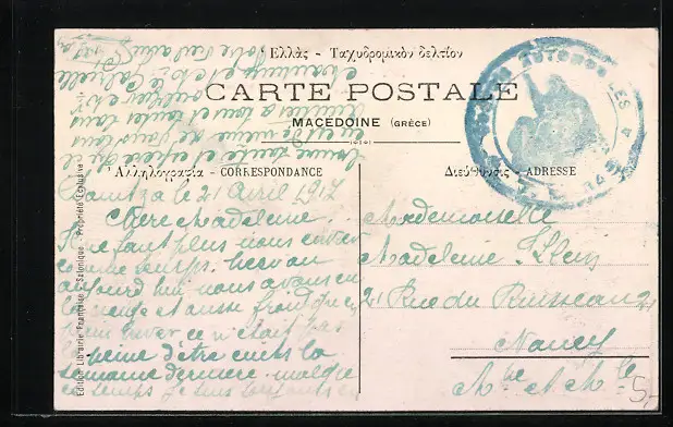Personenbezogene Daten auf der Rückseite der Karte wurden durch blauen Textmarker unkenntlich gemacht. Die blauen Stellen sind auf die Vorderseite durchgeweicht und wirken sich negativ auf das Postkartenfoto aus