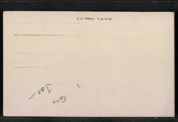 Personenbezogene Daten auf der Rückseite der Karte wurden durch blauen Textmarker unkenntlich gemacht. Die blauen Stellen sind auf die Vorderseite durchgeweicht und wirken sich negativ auf das Postkartenfoto aus