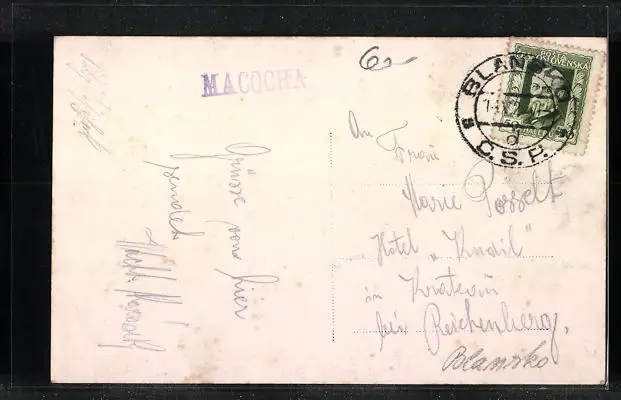 Personenbezogene Daten auf der Rückseite der Karte wurden durch blauen Textmarker unkenntlich gemacht. Die blauen Stellen sind auf die Vorderseite durchgeweicht und wirken sich negativ auf das Postkartenfoto aus