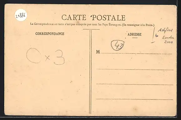 Personenbezogene Daten auf der Rückseite der Karte wurden durch blauen Textmarker unkenntlich gemacht. Die blauen Stellen sind auf die Vorderseite durchgeweicht und wirken sich negativ auf das Postkartenfoto aus