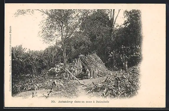 AK Madagascar, Antandroy dasn sa case à Itsimilofo, afrikanische Volkstypen