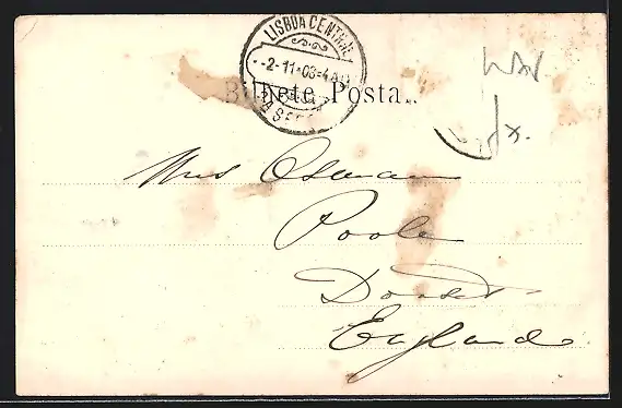 gelaufen 1903, Eckknick oben re., Briefmarke entfernt, rückseitig Oberflächenschaden, guter Zustand