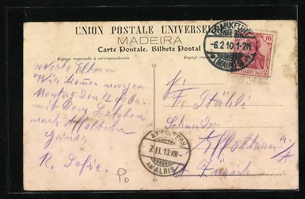 Personenbezogene Daten auf der Rückseite der Karte wurden durch blauen Textmarker unkenntlich gemacht. Die blauen Stellen sind auf die Vorderseite durchgeweicht und wirken sich negativ auf das Postkartenfoto aus