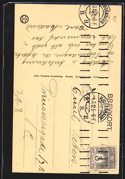 Personenbezogene Daten auf der Rückseite der Karte wurden durch blauen Textmarker unkenntlich gemacht. Die blauen Stellen sind auf die Vorderseite durchgeweicht und wirken sich negativ auf das Postkartenfoto aus